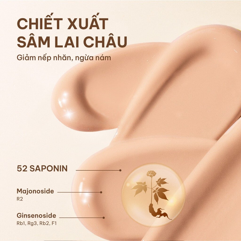 - Thành phần tự nhiên từ dược liệu Sâm quý hiếm giúp làm sáng da và ngăn chặn quá trình lão hóa da.
