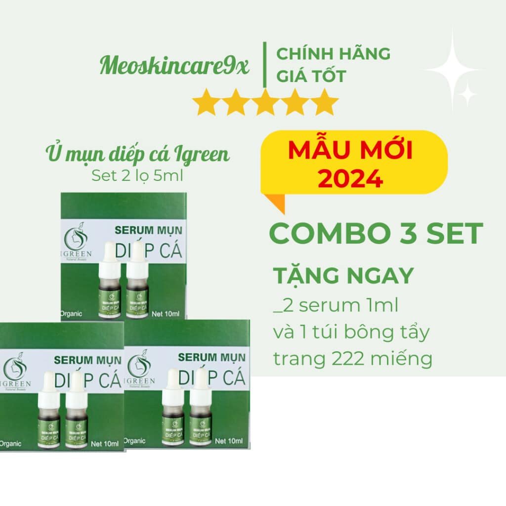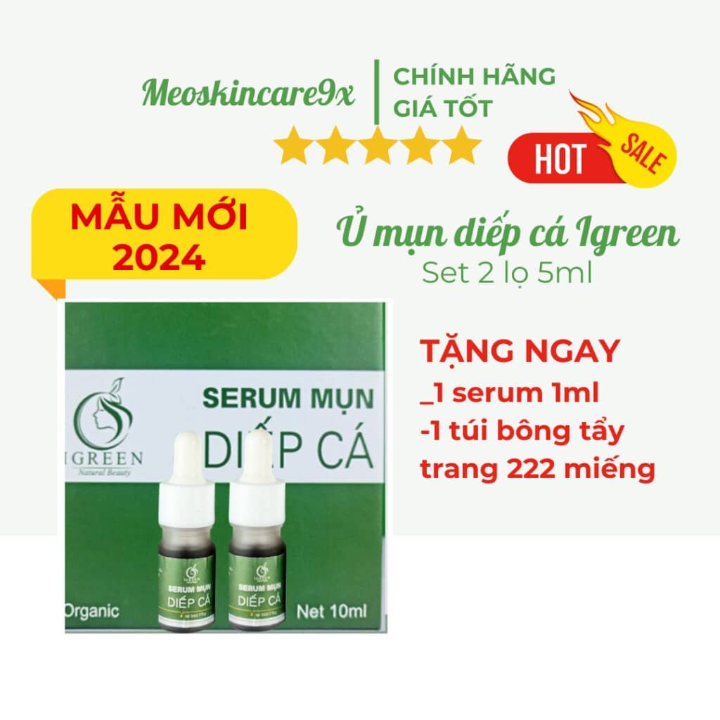 Serum Diếp Cá IGREEN là sản phẩm chăm sóc da thiên nhiên, giúp làm sạch mụn, giảm thâm, và se khít lỗ chân lông hiệu quả. Đặc biệt, sản phẩm phù hợp với mọi loại da, bao gồm cả da dầu, da nhạy cảm và cả da của các bà mẹ bầu. Đến với IGREEN, bạn không chỉ nhận được sự chăm sóc toàn diện cho làn da mụn mà còn được tặng quà hấp dẫn từ nhà phân phối chính hãng.